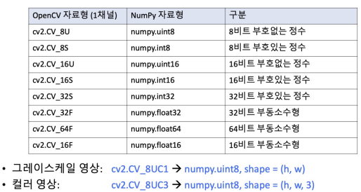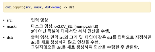 - 일부 함수* : cv2.copyTo(), cv2.calcHist(), cv2.bitwise_or(), cv2.matchTemplate(), etc.