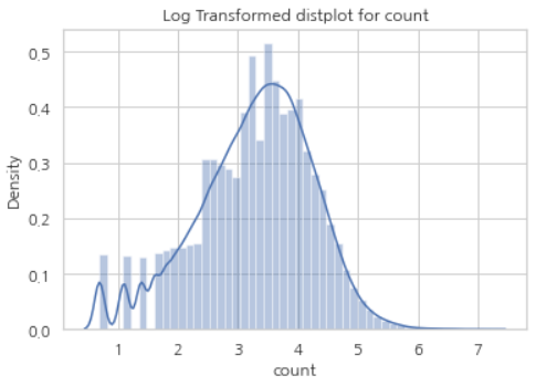 이럴 때 이용하는 것이, Log Transformation이다. 타겟의 값들을 log를 취해주면 정규분포 형태로 바뀌는 효과를 볼 수 있다. 변환에는 넘파이(numpy)의 log1p 함수를 활용했다.
