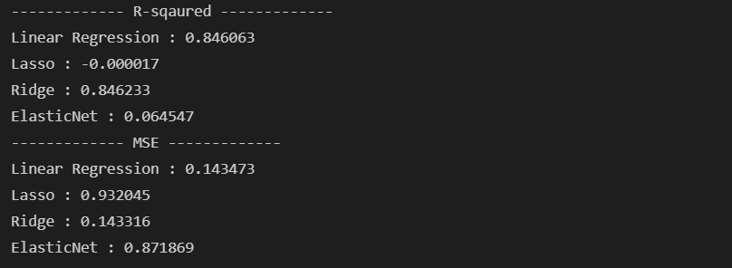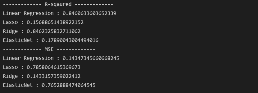 print(f'ElasticNet : {mean_squared_error(y_test, pred_en)}')