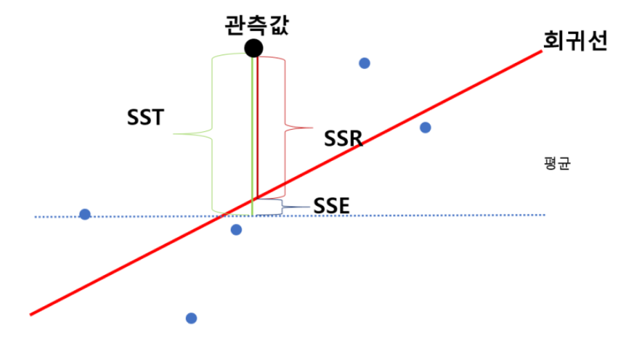 - SST(Total)는 좌측 그림에서 점(실제값)에서 y의 평균까지의 차이의 제곱, 즉 Y의 전체 변동성의 정도