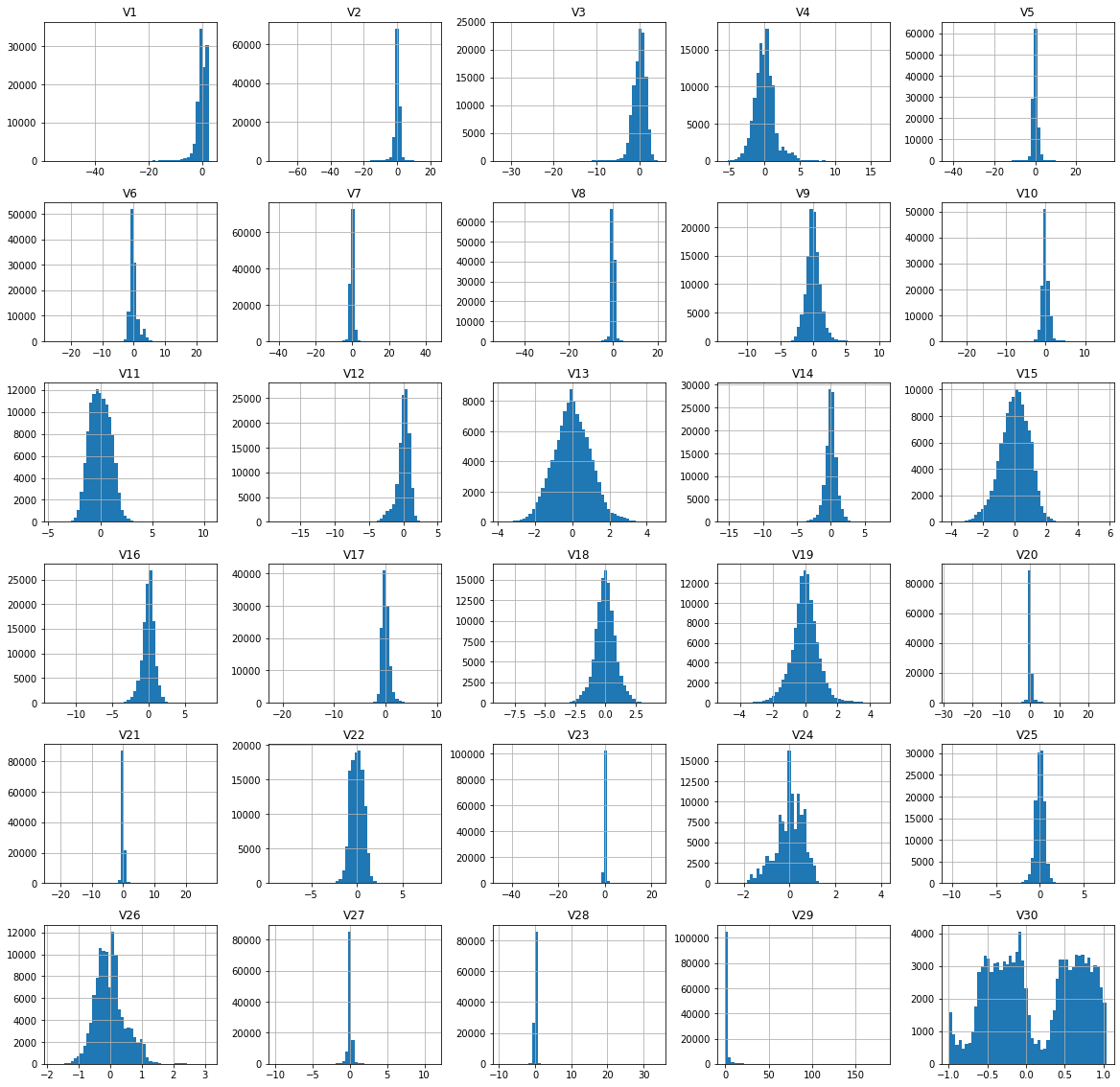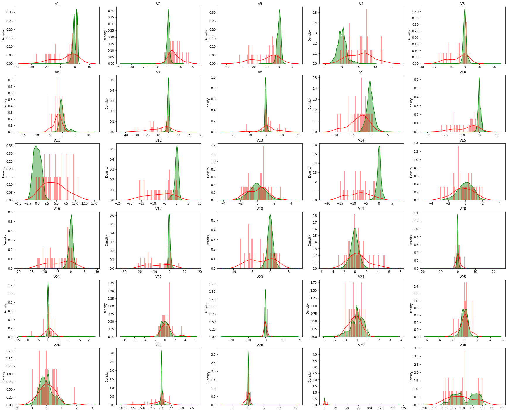 - Valid 쪽을 보면, Normal과 Fraud 분포의 색을 다르게 표시했는데, 구분 안 가는 컬럼이 몇몇 보이는 것을 알 수 있다.