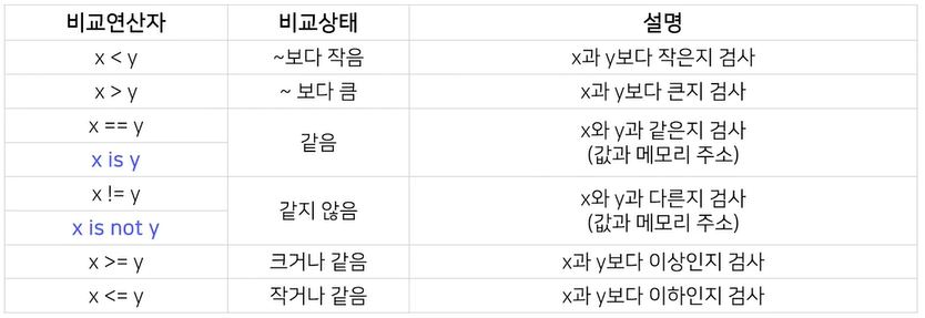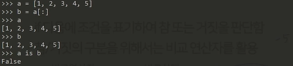 - a의 값과 b의 값이 같더라도 a is b가 False일 수 있음 -> is는 주소를 비교해서 같은지 확인하기 때문임