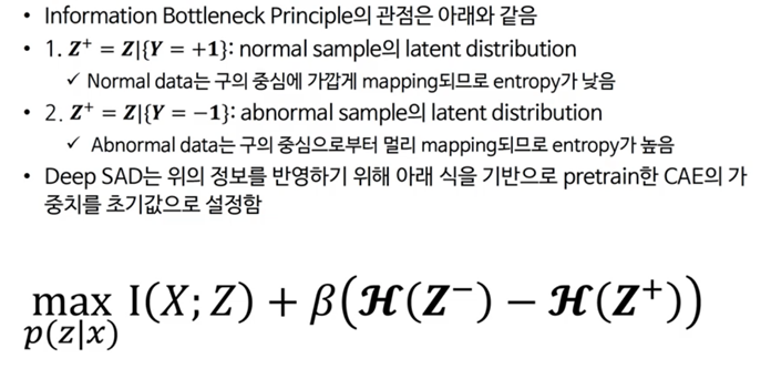 - Feature space 상 점과 중심 c와의 거리로 훈련되어, c 근방으로 정상 데이터가 매핑, 이상치는 c로부터 멀리 매핑되는 것