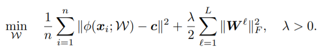 - 최적화를 통해 W는 정상 데이터의 공통적인 요소(Compaction of normal description)을 추출하여, 각 데이터 포인트를 구의 중심 c에 가깝게 mapping하도록 학습하는 것이 목표(Objective)