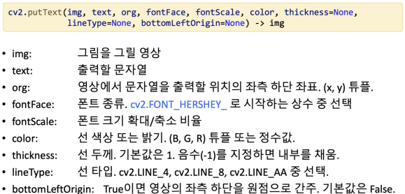 - line, rectangle, circle, polylines, putText