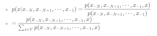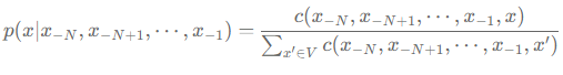 - 따라서 등장 확률은 p(x∣x−N,x−N+1,⋯,x−1)=∑x′∈Vc(x−N,x−N+1,⋯,x−1,x′)c(x−N,x−N+1,⋯,x−1,x) 입니다.