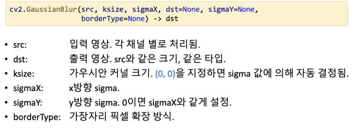- 가우시안 필터는 GaussianBlur() 등 별도로 제공되고 있다.