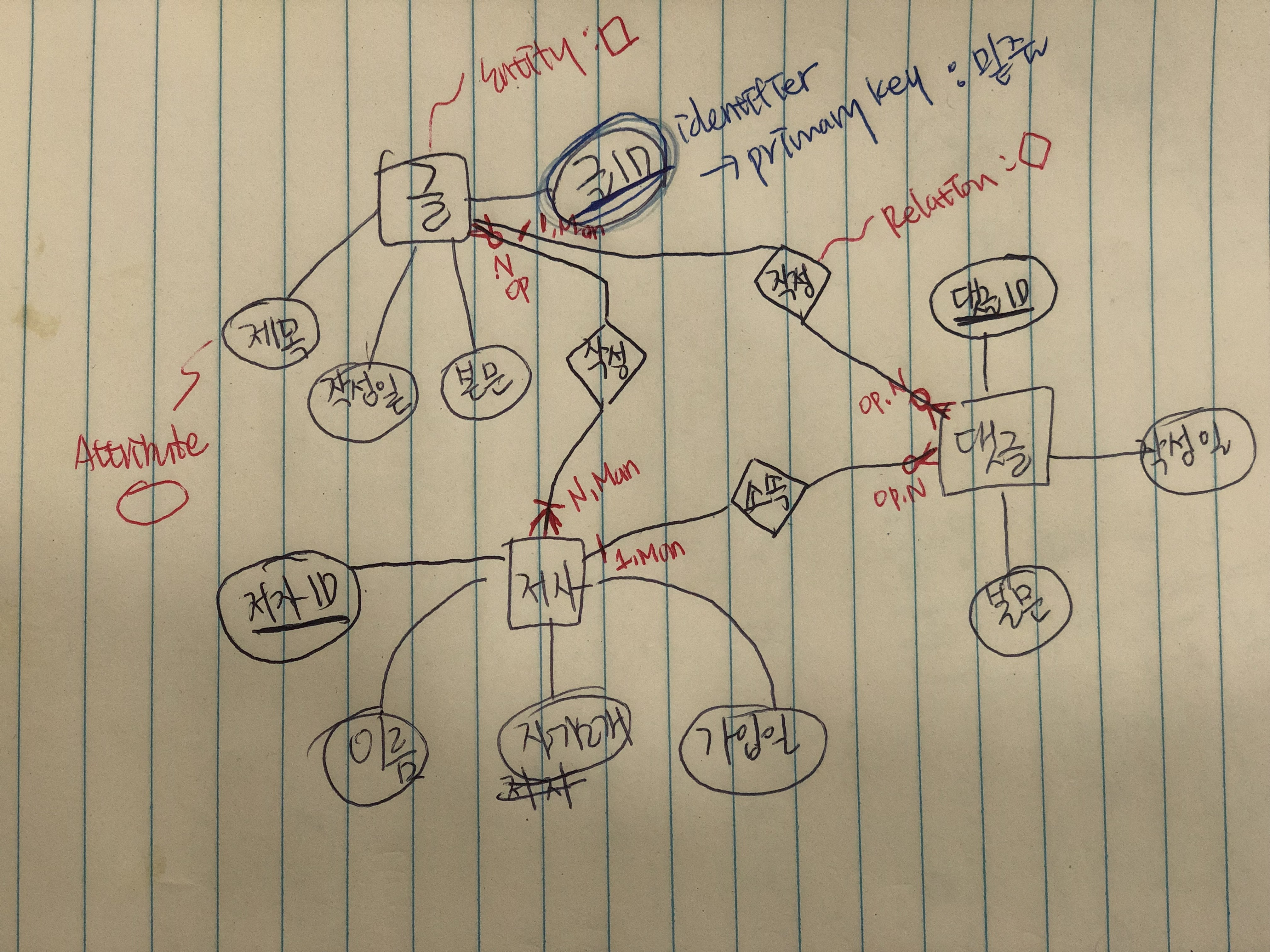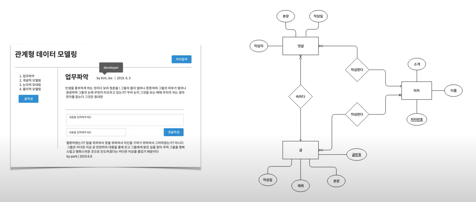 - ERD에서는 글 / 저자 / 댓글로 보는 것이 관계형 데이터베이스답다.