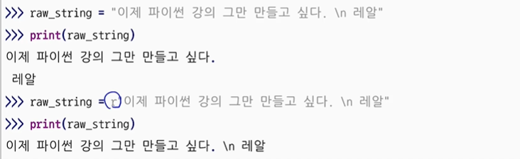 - raw string : 문자열 앞에 r을 적어주면, escape을 무시하고 그대로 출력함 Ex)
