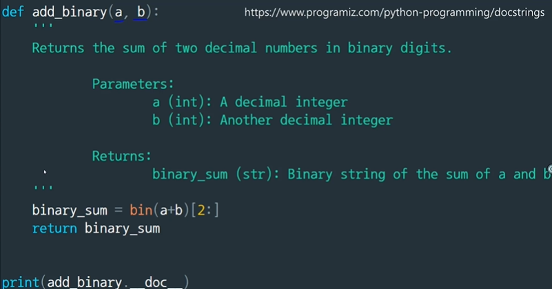 - 세 개의 따옴표로 docstring 영역 표시(함수명 아래)